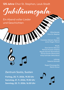 Mit einer musikalisch-theatralischen Eigenproduktion erzählt uns der Chor «St. Stephan» in der abendfüllenden «Jubiläumsgala» interessante Gegebenheiten aus seiner Geschichte und führt uns gesanglich durch das Liedgut der letzten 125 Jahre.